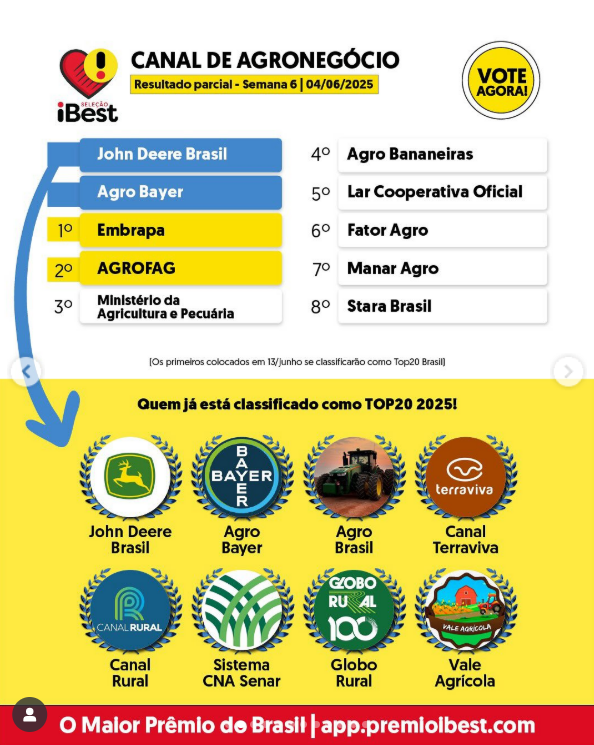 Em 2025, a Agro Bananeiras foi indicada ao Prêmio iBest na categoria Canal de Agronegócio, permanecendo entre as 10 páginas mais votadas desde o início da competição. Mesmo sem avançar para o Top 20°, tivemos a honra de dividir espaço com grandes nomes como John Deere, Globo Rural, Canal Rural e Bayer.